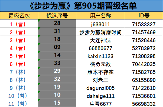 《步步为赢》第905期晋级名单公布