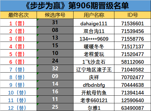 《步步为赢》第906期晋级名单公布